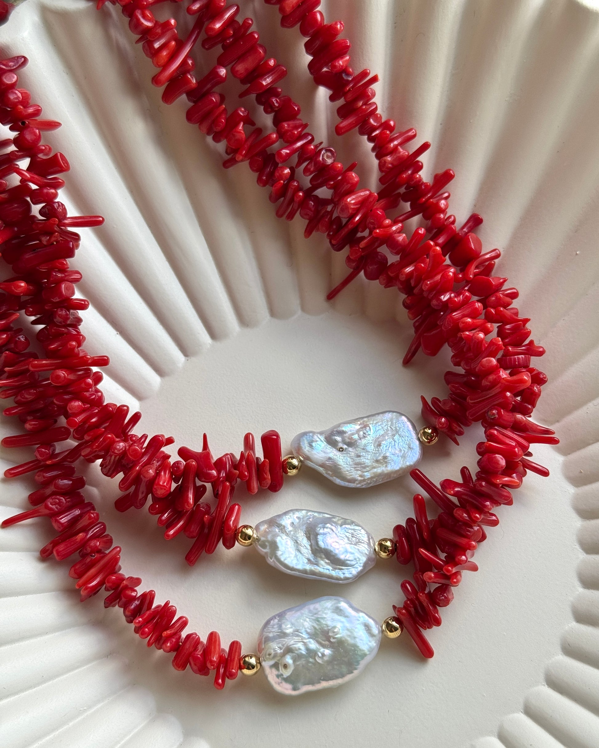 For those who carry the spirit of summer all year long, our Amalfi Necklace is a tribute to the strength and elegance of the Mediterranean. Vibrant red coral beads contrast with a freshwater baroque pearl, evoking sunsets and the soft foam of the sea.