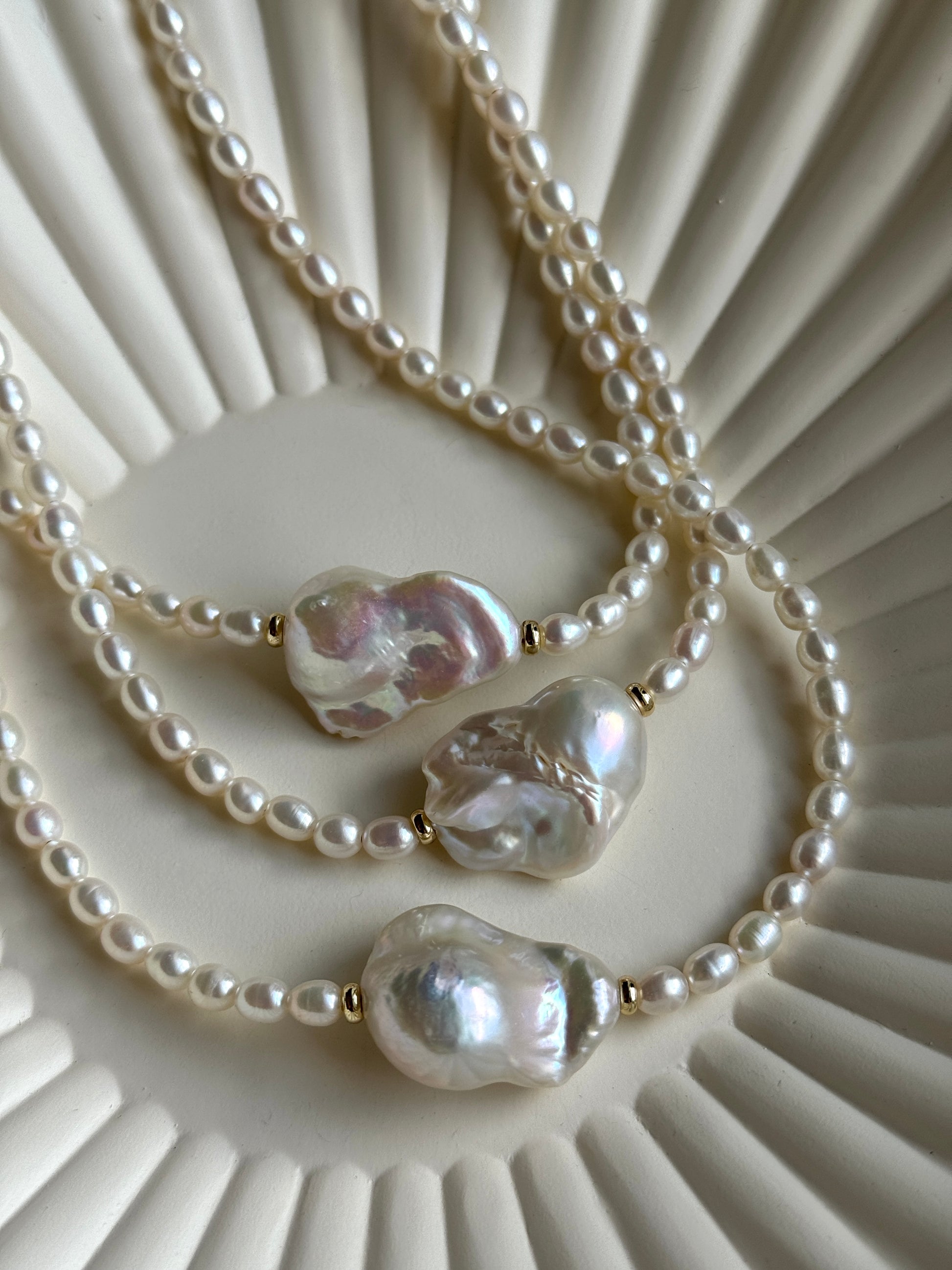 The Lux Necklace is a timeless piece that captures the allure of imperfection. Each necklace is hand-strung with AAA cultured freshwater pearls and features a central baroque cultured pearl — naturally shaped by the water, never identical, always singular.